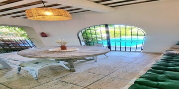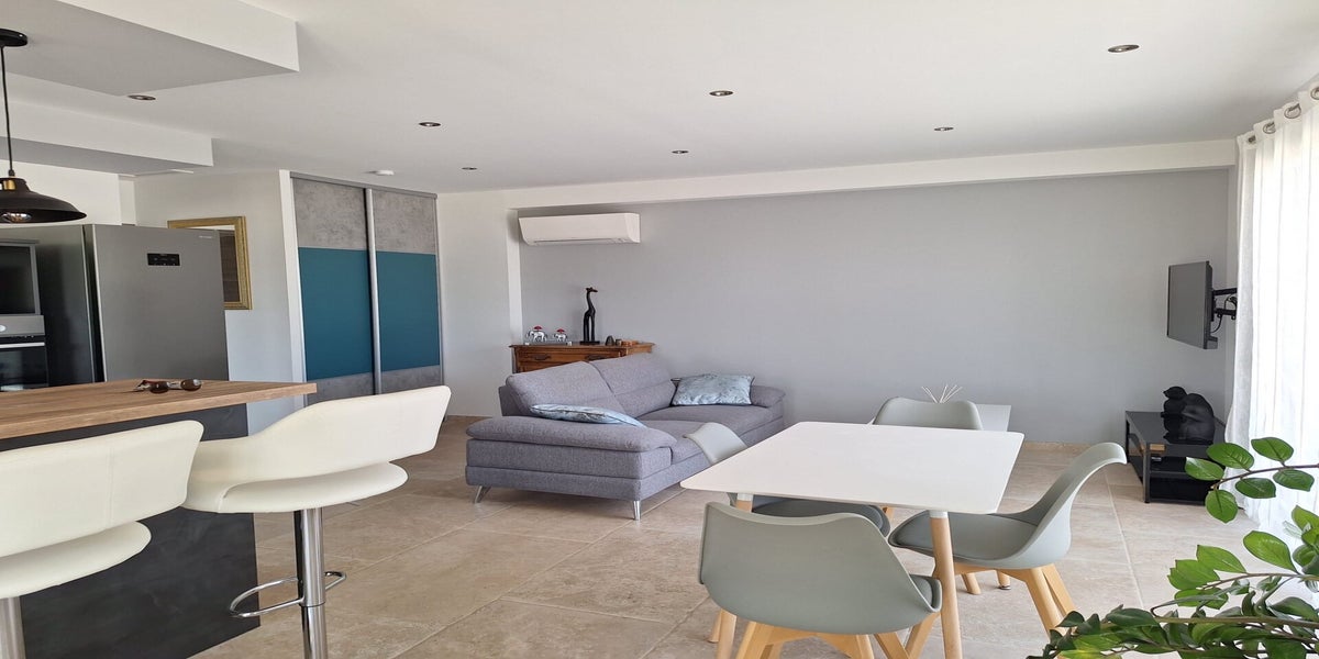 La pièce à vivre spacieuse et lumineuse donne directement sur la terrasse et piscine au sel, sécurisée par un rideau automatique.