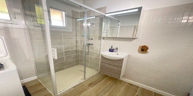 Une salle de bains moderne, équipée de tout le confort nécessaire avec douche à l'italienne et toilette, machine à laver,