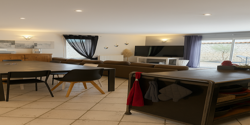 Gîte "Le Platane" de 100 m² classé 3*, situé sur un terrain clôturé de 1400 m², offre un cadre agréable avec son entrée indépendante. En rez-de-chaussée surélevé, il dispose d'une grande pièce à vivre comprenant une cuisine ouverte équipée (plaque de cuisson électrique, four, micro-ondes, lave-vaisselle, machine à café, bouilloire), d'une salle à manger et un espace détente avec canapé, télévision à écran plat, Wi-Fi et poêle à fuel. Un cellier, un WC indépendant avec lave-mains complètent cet espace.